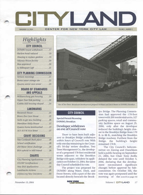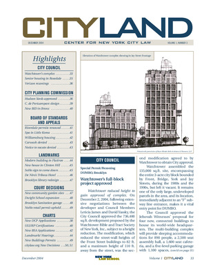 The December 2004 issue of CityLand covers major land use developments across New York City, including the approval of the Watchtower complex in DUMBO and the expansive Hudson Yards rezoning and redevelopment plan. It features updates on senior housing in Queens, rezonings in Clinton and Midtown South, and the creation of a new Business Improvement District near Yankee Stadium. Landmark decisions include the approval of a modern residential building in the Flatiron District, a new hotel in Tribeca backed by Robert De Niro, and the redesign of the Brooklyn Public Library plaza. The issue also includes court rulings on community gardens, sanitation garage siting, and zoning variances, along with charts tracking ULURP certifications, BSA applications, and building permits.
