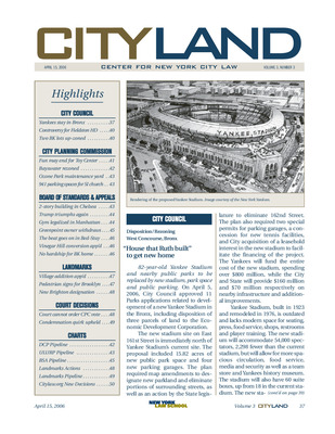 The April 2006 issue of CityLand centers on the City Council’s approval of the new Yankee Stadium project in the Bronx, which includes a new stadium, 15.82 acres of new parkland, four parking garages, and a Yankees museum. The Council also held a hearing on the controversial designation of the Fieldston Historic District in the Bronx and approved a modified upzoning for two lots in East Windsor Terrace, Brooklyn. The Planning Commission approved the conversion of the Toy Center in Chelsea to residential use, a rezoning of 82 blocks in Bayswater and Far Rockaway, and a new DOT maintenance yard in Ozone Park. Staten Island saw approval of a 941-space parking lot for Gateway Cathedral. BSA decisions included variances for a 12-story building in Chelsea, legalization of the Equinox gym on Third Avenue, and a residential conversion in Vinegar Hill. Other BSA actions addressed music studio use in Bedford-Stuyvesant, a withdrawn Greenpoint application, and a denied variance for a Sheepshead Bay home. Landmark actions included approval of a three-story rear addition in Greenwich Village, directional signage in Brooklyn historic districts, and designation of 1 Pendleton Place in Staten Island. Court decisions covered the City Planning Commission’s authority to manage its calendar, condemnation procedures, and challenges to landmark designations. Pipeline charts track ULURP certifications, BSA applications, and landmark actions.
