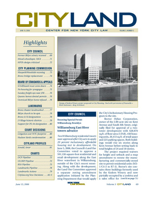 The June 2006 issue of CityLand highlights significant land use, preservation, and development actions across New York City. The City Council approved a two-tower residential development on the Williamsburg waterfront and applied the Inclusionary Housing Program to the site. A mixed-use development combining a public school and residential tower was approved on the Upper East Side, facilitated by amendments to the Educational Construction Fund zoning provisions. The Planning Commission approved a 134-block rezoning in Maspeth and Woodside, Queens, and the construction of a new Willis Avenue Bridge over the Harlem River. BSA decisions included variances for a Williamsburg synagogue, a freight facility near JFK, and a denied permit for an oversized home in Manhattan Beach. Landmark actions included the designation of the Loew’s Paradise Theater interior in the Bronx, the Estey Piano Factory, the DeHart House in Staten Island, and two new historic districts in the West Village. The conversion of a Cobble Hill church into residences was also approved. Legal updates covered litigation over the World Trade Center memorial footprint and a challenge to Hudson Yards condemnation. A profile of DOB’s General Counsel and Deputy Commissioner discussed the city’s efforts to adopt a revised model building code. Pipeline charts track ULURP certifications, BSA applications, and landmark actions.