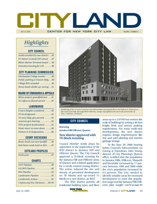 The July 2006 issue of CityLand covers major land use and preservation developments across New York City. The City Council approved a 70-block rezoning in Jamaica Hill and Hillcrest, Queens, including the creation of a new R5D zoning district. Forest City Ratner’s 75-story development in Lower Manhattan will include a public school. The Council also approved a lease for the South Brooklyn Marine Terminal and a 12-story homeless housing facility on East Houston Street. The Planning Commission approved a rezoning and pedestrian bridge for Manhattan College’s parking garage and supermarket project, and a special permit for public parking at the Viacom Building in Times Square. The Village Alliance BID was expanded, and a rezoning in Pelham Parkway/Indian Village was sent to Council. BSA decisions included vested rights approvals for South Park Slope developments and a denial for a flawed permit in Briarwood. Landmark actions included the designation of P.S. 64, WPA-era civic projects (Astoria Play Center, Orchard Beach Bathhouse), a firehouse, an automat, and historic buildings in Harlem and Staten Island. Legal updates covered a cancer lawsuit linked to the Pelham Bay landfill and a court remand of a Red Hook condo variance. A profile of new Landmarks Commissioner Margery H. Perlmutter explored her background and controversial confirmation. Pipeline charts track ULURP certifications, BSA applications, and landmark actions.