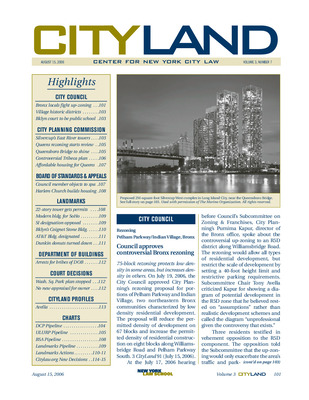 The August 2006 issue of CityLand covers significant land use and preservation developments across New York City. The City Council approved a controversial rezoning in Pelham Parkway and Indian Village, Bronx, and finalized designations for two West Village historic districts. The School Construction Authority received approval to convert the former Brooklyn Family Court into a high school. The Planning Commission approved Silvercup Studios’ 2-million-square-foot mixed-use development in Long Island City, and certified a downzoning proposal for Douglaston/Little Neck. A private developer’s rezoning in North Tribeca was approved despite opposition. The Commission also extended the inclusionary housing program to Queens for the first time. BSA decisions included a special permit for Spa World in College Point and a variance for a Harlem church’s residential project. Landmark actions included designations for the AT&T Building and lobby, the Coignet Stone Company Building in Gowanus, and hearings on the Thompson House in Staten Island. The Department of Investigation arrested several individuals for bribery and forgery involving DOB. Legal updates covered a court injunction halting renovations to Washington Square Park and a denied motion to revise an appraisal in an eminent domain case. A profile of Council Member Tony Avella highlighted his land use reform initiatives, including BSA oversight, architectural review boards, and stricter enforcement of illegal construction. Pipeline charts track ULURP certifications, BSA applications, and landmark actions.