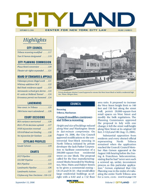 The September 2006 issue of CityLand covers major land use and preservation developments across New York City. The City Council approved a modified rezoning in North Tribeca, reducing building height and floor area in response to community opposition. Landmark designations for two Staten Island homes were approved despite owner objections. The Planning Commission approved a special permit for retail use at the Plaza Hotel and expanded air rights for the Hirschfeld Theatre. BSA decisions included denial of a permit for illegal demolition in Park Slope, approval of variances for the Whitney Museum expansion, residential use in Red Hook, a dormitory for Vaughn College, and apartments near the Holland Tunnel. A variance request in Holliswood was denied due to lack of hardship. Landmark permits were issued for new construction in Tribeca and SoHo, and the Van Tassel Horse Mart was calendared for designation. Legal updates included a court overturning a BSA variance in Staten Island, upholding BSA’s decision on P.S. 64, reversing a DOB injunction, and ruling that UDAAP deed restrictions do not bind future owners. A court denied an injunction to halt Yankees Stadium construction. A profile of DOT Assistant Commissioner Kerry Gould-Schmit highlighted the billion-dollar street furniture franchise. Pipeline charts track ULURP certifications, BSA applications, and landmark actions.