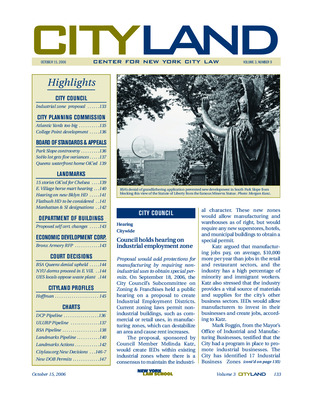 The October 2006 issue of CityLand highlights major land use, preservation, and development actions across New York City. The City Council held hearings on a proposal to create Industrial Employment Districts to protect manufacturing zones. The Planning Commission recommended an eight percent reduction in Forest City Ratner’s Atlantic Yards project and approved development in College Point after resolving landfill issues. BSA denied a grandfathering application in South Park Slope and approved variances for a SoHo development and a waterfront home in Douglaston. Landmark actions included approval of a 15-story building in the Ladies’ Mile Historic District, an emergency hearing on the Van Tassel Horse Mart, and hearings on proposed historic districts in Crown Heights and Flatbush. The Morse Building and Staten Island Savings Bank were designated as individual landmarks. The Department of Buildings proposed rule changes to expand grounds for suspending architects and engineers from the self-certification program. The Economic Development Corporation issued an RFP for the redevelopment of the Kingsbridge Armory. Legal updates covered court decisions on a Queens homeless housing expansion, NYU’s East Village dormitory, and a waste transfer station on East 91st Street. A profile of Earth Pledge Executive Director Leslie Hoffman explored green roof initiatives and sustainable design in New York City. Pipeline charts track ULURP certifications, BSA applications, and landmark actions.