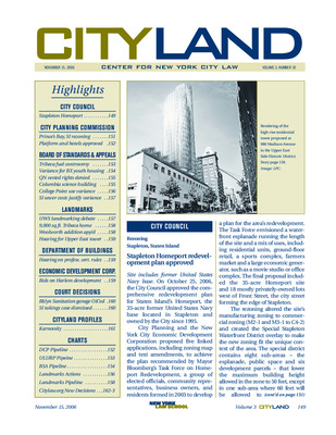 The November 2006 issue of CityLand covers significant land use, preservation, and development actions across New York City. The City Council approved the redevelopment plan for Stapleton Homeport in Staten Island, transforming a former Navy base into a mixed-use waterfront district. The Planning Commission approved rezoning in Prince’s Bay and special permits for hotel development over Amtrak rail lines in Clinton. BSA decisions included a variance for youth housing in the Bronx, denial of vested rights in Queens, and approval of Columbia University’s science building. Landmark actions included hearings on the Dakota and New York Cab Company stables in the Upper West Side, a controversial Norman Foster-designed tower at 980 Madison Avenue, and approvals for a private residence in Tribeca and rooftop additions to the Woolworth Building. The Department of Buildings held a hearing on proposed rule changes to tighten professional certification standards. The Economic Development Corporation reissued an RFP for a six-acre Harlem site after community opposition to the original plan. Legal updates covered court decisions on a sanitation garage in Clinton Hill and a takings claim in Staten Island. A profile of City Planning’s General Counsel David Karnovsky explored emerging planning issues, including Broadway air rights, community board planning tools, and waterfront esplanade implementation. Pipeline charts track ULURP certifications, BSA applications, and landmark actions.