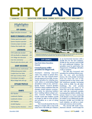 The December 2006 issue of CityLand covers major land use, preservation, and legal developments across New York City. The City Council passed legislation increasing penalties for illegal construction and unauthorized demolition. BSA approved variances for residential and hospital developments in Chelsea and Queens, and a mixed-use project on a former cemetery site in Corona. Landmarks designated the New York Cab Company Stable but declined to landmark the Dakota Stables due to preemptive alterations. The Commission re-designated two City and Suburban Homes buildings in Lenox Hill, reversing a 1990 Board of Estimate decision. Hearings were held on three Far West Village buildings and a cast-iron building at 63 Nassau Street. Legal updates included the denial of brownfield tax credits for Robert DeNiro’s Tribeca hotel, a court ruling against TransGas Energy’s condemnation attempt in Williamsburg, and the rejection of a challenge to the Yankee Stadium redevelopment. The Brooklyn Bridge Park plan withstood legal scrutiny over its inclusion of private residential development. A profile of environmental attorney David Paget explored the evolution of environmental impact statements and their role in shaping major city projects. Pipeline charts track ULURP certifications, BSA applications, and landmark actions.
