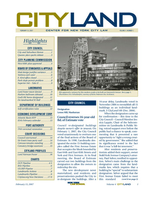 The February 2007 issue of CityLand covers major land use, preservation, and development actions across New York City. The City Council re-designated the First Avenue Estate buildings in Lenox Hill, reversing a 1990 Board of Estimate decision. A controversial rezoning in Douglaston and Little Neck was modified and approved. The Planning Commission approved a rezoning and special permits for a mixed-use development near Lincoln Center, including a new bulk waiver affecting ten community districts. BSA decisions included variances for a modern condo on Greenwich Avenue, denial of a catering hall in a Brooklyn yeshiva, and refusal to grandfather Park Slope condos built on invalid permits. A revised plan for the Superior Ink site was approved, and Landmarks rejected Lord Norman Foster’s proposed tower addition to 980 Madison Avenue. Hearings were held on the Renaissance Ballroom in Harlem and the Elwell House in Clinton Hill, which was designated amid demolition concerns. Landmarks rescinded the designation of the New Brighton Village Hall in Staten Island after its demolition. The Department of Buildings adopted expanded self-certification rules. EDC issued an RFP for the Atlantic Basin Marina in Red Hook and announced $811 million in bond offerings. The Port Authority sought proposals for restoration of the landmarked TWA terminal at JFK. Legal updates included court decisions on a Brooklyn rezoning, a party wall dispute in Midtown, a street furniture franchise challenge, and a bridge easement in Cypress Hills Cemetery. A profile of Lord Norman Foster explored his architectural philosophy and experiences with New York’s approval processes.
