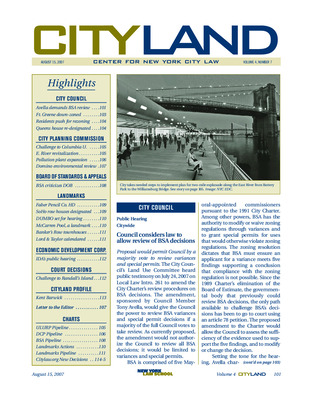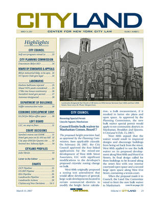 The March 2007 issue of CityLand covers significant land use, preservation, and development actions across New York City. The City Council approved a modified bulk waiver for West 60th Street Associates’ mixed-use development, limiting its applicability to Manhattan Community Board 7. Council also passed amendments to the Department of Buildings’ self-certification program, tightening rules and enforcement. The Planning Commission approved the creation of the Court Livingston Schermerhorn BID in Downtown Brooklyn. BSA decisions included a variance for residential conversion in Carroll Gardens and legalization of a New York Sports Club in SoHo. Landmarks rejected designation of the Renaissance Ballroom in Harlem, citing community opposition, and held hearings on nine WPA-era pools built under Robert Moses. Hearings were also held on three Federal-style row houses on Greenwich Street, with ownership disputes complicating the landmarking process. A four-story addition to the Lambs Club was approved, and the Horn & Hardart Automat building was designated. Two Harlem churches—St. Aloysius and All Saints—were also designated. The Department of Buildings proposed stricter rules for construction superintendents. EDC’s IDA awarded $3.2 million in tax exemptions for a major mixed-use development in Downtown Brooklyn. Legal updates included a $500K fine for Sushi Samba’s illegal roof structure, a $9M valuation for a condemned Queens waterfront site, and a successful challenge to a $1.4M transfer tax bill by Regal Hotels. A profile of Julie Menin, Chair of Manhattan Community Board 1, explored proactive planning efforts in Lower Manhattan.
