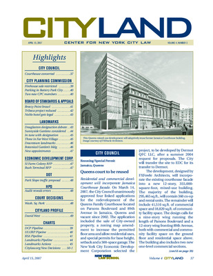 The April 2007 issue of CityLand covers major land use, preservation, and development actions across New York City. The City Council approved redevelopment of the former Jamaica Courthouse into a mixed-use building incorporating the historic facade. The Planning Commission approved the sale of a former firehouse with a restriction for community use and a 369-space garage in Battery Park City. BSA decisions included a contentious appeal over a Breezy Point home, variances for residential buildings in Tribeca, and legalization of a NoHo hotel. Landmarks held a new hearing on re-inclusion of a Douglaston home into a historic district and calendared Sunnyside Gardens for designation. The Sohmer Piano Factory in Queens and three Far West Village buildings were designated. Additional designations included two Park Place buildings and the Brooklyn Botanical Garden’s Laboratory Administration Building. EDC issued RFPs for redevelopment of the Staten Island Farm Colony and Bush Terminal in Brooklyn. DOT proposed traffic changes in Park Slope. HPD was criticized in a Comptroller audit of the J-51 tax incentive program. The courts ruled on Washington Square Park renovations, a $9M valuation for a Queens condemnation, and a Second Avenue Subway condemnation challenge. A profile of architect David West explored his zoning expertise and work on high-profile projects like 443 Greenwich Street.