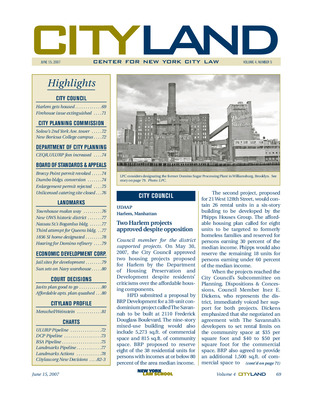 The June 2007 issue of CityLand covers major land use, preservation, and development actions across New York City. The City Council approved two affordable housing projects in Harlem despite community opposition and added restrictions to the sale of four former firehouses, limiting them to community use. Solow Management’s proposed 37-story tower on York Avenue entered public review, and HPD’s Boricua Village proposal for a large mixed-use development in Melrose, Bronx was approved. City Planning increased CEQR and ULURP fees. BSA dismissed a contentious Breezy Point appeal and approved a Dumbo residential conversion. A catering hall in Boro Park was ordered closed, and a Manhattan Beach enlargement permit was rejected. Landmarks designated the Manhattan Avenue Historic District, 63 Nassau Street (a Bogardus cast-iron building), the Sohmer Piano Factory, and the Wyeth House in Staten Island. A hearing was held for the Domino Sugar Plant in Williamsburg. EDC issued RFPs for redevelopment of jail-adjacent sites in Downtown Brooklyn and selected developers for a Navy warehouse conversion in Sunset Park. Court decisions upheld the Javits Center expansion and struck down a local law aimed at preserving affordable housing. A profile of Ronay Menschel and Adam Weinstein of Phipps Houses explored their leadership in affordable housing development.