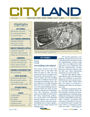 The July 2007 issue of CityLand covers major land use, preservation, and development actions across New York City. The City Council adopted a new Building Code, the first major revision since 1968, to take effect in July 2008. A joint oversight hearing examined EDC’s $3 billion redevelopment plan for Willets Point, raising concerns over displacement and eminent domain. The Council approved the sale of air rights from a City-owned site in Downtown Brooklyn to facilitate a residential tower. Columbia University and Community Board 9 submitted competing development plans for Manhattanville. Solow Properties filed applications for a major redevelopment of the former Con Edison site. BSA decisions included a denial of a challenge to NYU’s East Village dormitory, a reversal of DOB’s permit denial in Staten Island, and a ruling against a developer in Queens on vested rights. Landmarks designated Sunnyside Gardens as a historic district and held a hearing on the Domino Sugar Refinery. New leopard habitats were approved for Central Park and Prospect Park Zoos. Court decisions addressed the legality of the Atlantic Yards project, the East 91st Street transfer station, and the P.S. 64 dormitory permit. A profile of Simeon Bankoff, Executive Director of the Historic Districts Council, explored his advocacy for preservation and reform of the Landmarks process.