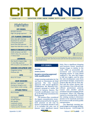 The September 2007 issue of CityLand covers major land use, preservation, and development actions across New York City. The City Council approved the Jamaica rezoning plan with modifications, including changes to Hillside Avenue and manufacturing zones near the LIRR. Related Companies received approval for a 210-space garage at its High Line-adjacent luxury development. Solow Properties’ massive East Side redevelopment plan began public review. Basketball City was approved to relocate to Pier 36. City Planning proposed a zoning text amendment to make Landmarks the sole permitting authority for Sunnyside Gardens. The Commission approved a new BID for Hunts Point and a 51-block rezoning for the Upper West Side. BSA upheld DOB’s authority to permit rooftop cell phone antennas and approved a controversial Staten Island health care facility. It also granted variances for the conversion of the Maritime Union building into a hotel. Landmarks approved new buildings in the South Street Seaport and Ladies’ Mile districts and designated the WPA-era Highbridge Pool. EDC issued RFPs for congestion pricing implementation and redevelopment of two former Brooklyn firehouses. NYPD held a hearing on a proposed 911 dispatch center in the Bronx. Court decisions included a reversal of BSA’s denial of a variance, a tenant victory in a Williamsburg eviction case, and a rejection of a challenge to a Brooklyn rezoning. A profile of Bruce Schaller, DOT’s Deputy Commissioner, explored his role in advancing congestion pricing.