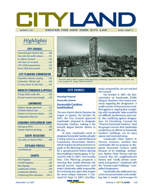This issue of CityLand covers significant land use and zoning developments in New York City as of November 15, 2007. Highlights include the designation of Sunnyside Gardens as a historic district, updates to public plaza design standards, and rezoning efforts in Forest Hills, St. Albans, and Hollis. The issue also reports on the Moynihan Station redevelopment, Columbia University's expansion plans in Manhattanville, and legal challenges surrounding the Trump SoHo development. Landmark designations, including the Lord & Taylor Building and the Eberhard Faber Pencil Company complex, are featured alongside summaries of ULURP and BSA pipeline applications. The issue concludes with a profile of Carl Weisbrod and his impact on urban revitalization.
