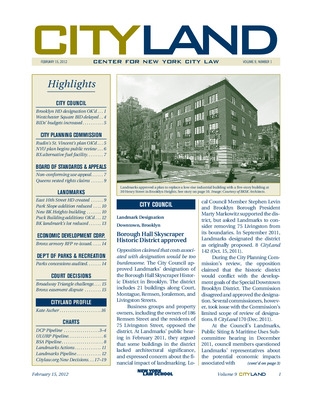 This issue of CityLand covers significant land use and zoning developments in New York City as of February 15, 2012. The City Council approved the designation of the Borough Hall Skyscraper Historic District in Downtown Brooklyn, despite opposition from property owners concerned about economic impacts. The Westchester Square BID re-entered its objection period due to notice delivery issues, and six BIDs across the city received budget increases. The City Planning Commission approved Rudin Management’s redevelopment plan for the former St. Vincent’s Hospital site and certified NYU’s long-term campus expansion proposal in Greenwich Village. A public alternative fueling station was approved for Hunts Point, Bronx. Landmark designations included the East 10th Street Historic District and the Brooklyn Union Gas Company Building. Rooftop additions were approved for the Puck Building and a Park Slope townhouse after revisions. The Coignet Building’s landmark boundaries were reduced to accommodate Whole Foods development. The Economic Development Corporation reissued an RFP for the Kingsbridge Armory, emphasizing living wage provisions. Court decisions addressed housing discrimination in the Broadway Triangle redevelopment and public access rights to a Bronx beach. A profile of Kate Ascher explores her work on urban infrastructure and parkland planning around Jamaica Bay.