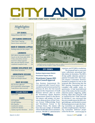 This issue of CityLand covers key land use and zoning developments in New York City as of March 15, 2012. The City Council approved the creation of the Westchester Square BID in the Bronx after resolving procedural notice issues. The City Planning Commission held a hearing on the “Zone Green” zoning text amendment to promote energy-efficient retrofits and green building design. A residential development was authorized in a manufacturing district in Ridgewood, Queens. BSA approved reduced parking requirements for a medical facility in Brooklyn despite community opposition. Landmark approvals included the Metropolitan Museum of Art’s plaza renovation and the restoration of Tavern on the Green. A proposal to demolish a historic Tribeca facade was denied, and Governors Island’s redevelopment plan received approval for signage and landscaping. A revised plan for development near the Whitney Museum was presented. Landmarks proposed new citywide storefront rules to streamline approvals. Fresh Direct received an $81 million incentive package to relocate to the Bronx, sparking debate over labor practices and environmental impact. Administrative decisions addressed padlock law enforcement and loft law protections. Court decisions upheld BSA’s hotel extension in Dutch Kills, increased compensation for MTA acquisitions in Sunnyside, and allowed trade fixture claims in Lower Manhattan. A profile of Carol Clark highlights her work at HPD and her commitment to affordable housing and historic preservation.