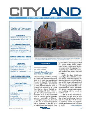 This issue of CityLand explores legal, planning, and preservation developments in New York City as of December 2012. It features a student article on the legal distinctions between accessory and advertising signs, and the regulatory frameworks governing signage in residential, commercial, and manufacturing districts. The City Council rejected the sale of 22 Reade Street to preserve its potential use for an African Burial Ground Museum, while approving the sale of 49–51 Chambers Street. The Brinckerhoff Cemetery in Queens was designated a landmark despite opposition from the property owner. The Council also approved reduced parking requirements for Downtown Brooklyn to encourage affordable housing. The Ridley & Sons Department Store buildings were designated as individual landmarks. Durst Development’s mixed-use project on the Hudson River re-entered ULURP, facing scrutiny over affordable housing provisions. Landmark hearings included proposals for the Brooklyn Heights Cinema redevelopment, the Marine Midland Bank building, and the conversion of a Harlem firehouse into a cultural center. The issue also covers the approval of a 23-story hotel on Fifth Avenue, the Domino Sugar project’s survival of a legal challenge, and an ECB decision regarding illegal adult establishment use. A profile of Michael Best, Counselor to Mayor Bloomberg, highlights his role during Hurricane Sandy.