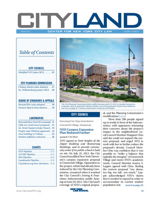 This issue of CityLand covers major land use and preservation developments in New York City as of August 2012. The City Council approved a further-reduced version of NYU’s Core Expansion Plan, including height reductions and community space commitments. The City Planning Commission held a hearing on Jamestown Properties’ Chelsea Market expansion, which faced opposition over its impact on the High Line and lack of affordable housing. A rezoning in South Williamsburg was approved to facilitate a two-building residential project with affordable units. The Board of Standards & Appeals adopted revised rules to streamline application procedures and approved a special permit for a Western Beef supermarket in Harlem. Landmarks designated the Riverside Drive–West End Historic District Extension I and considered a 23-story hotel tower near the Plaza Hotel. Projects in the South Street Seaport and Upper East Side (adjacent to the Whitney Museum) were reviewed, with the latter approved after multiple revisions. A nine-story residential building in Tribeca was approved following design changes, while a proposed rooftop addition in Harlem was sent back for redesign. The issue also includes charts on ULURP, BSA, and Landmarks activity.