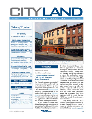 This issue of CityLand covers key land use and preservation developments in New York City as of September 2012. The City Council denied a sidewalk café permit for Buschenschank restaurant in Carroll Gardens due to inaccurate plans and noise complaints. The City Planning Commission certified Trinity Church’s proposal to create the Special Hudson Square District, and approved the Seward Park Mixed-Use Development Project and NYCHA’s Soundview affordable housing plan. BSA approved a rooftop addition to a townhouse on West 78th Street. Landmarks designated the Brinckerhoff Cemetery in Queens and calendared the Rainbow Room for interior landmark status. A new building and carriage house were approved for 437 Henry Street in Cobble Hill. EDC issued an RFP for reuse of the Bedford–Atlantic Armory drill hall. ECB upheld $40,000 in fines for illegal signage on a Brooklyn bodega, and Buildings padlocked a Gravesend property used for commercial purposes. Guest commentary by Steven Spinola of REBNY called for reforms to the landmark designation process. City Planning’s Carol Samol was profiled for her work in Bronx redevelopment and ULURP pre-certification reform.