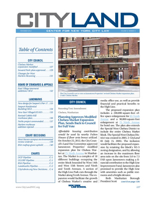 This issue of CityLand covers significant land use, zoning, and preservation developments in New York City as of November 2012. Key highlights include the City Council’s approval of Jamestown Properties’ modified Chelsea Market expansion plan, which includes contributions to affordable housing and the High Line. The Seward Park Mixed-Use Development Project was approved with increased housing units and space for a public school. The West Harlem rezoning plan was modified to address community concerns, including preservation of affordable housing. The Board of Standards & Appeals approved rooftop additions to East Village tenements despite opposition. Landmark Preservation Commission approved revised plans for Pier 17 and a narrow residential building in the South Street Seaport Historic District, and designated the East Village/Lower East Side Historic District. The issue also includes a commentary on Con Edison’s response to Hurricane Sandy and a court decision requiring supplemental environmental review for the Mott Haven school campus. Additional coverage includes zoning pipelines, BSA filings, and landmark approvals.