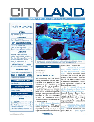 This issue of CityLand highlights major land use and preservation developments in New York City as of February 2013. It opens with a retrospective of the top ten stories of 2012, including NYU’s campus expansion, the landmarking of Brinckerhoff Cemetery, and the Chelsea Market expansion. The City Council approved the East Village/Lower East Side Historic District, while the City Planning Commission celebrated its 75th anniversary and advanced the Durst West 57th Street development. A proposed rezoning in Flushing faced opposition from Community Board 7. Landmark Preservation Commission approved the renovation of the Rainbow Room and denied legalization of unauthorized alterations to the Gage & Tollner interior. Hearings were held for the proposed Bedford-Stuyvesant and Harrison Street Historic Districts. A nine-story residential building was proposed for a vacant lot in SoHo. The Historic Districts Council announced its “Six to Celebrate” preservation priorities for 2013. A judge halted the City’s plan to open a restaurant in Union Square Park, citing the Public Trust Doctrine. The Board of Standards & Appeals approved a mixed-use development in Harlem despite community opposition. A profile of Council Member Domenic Recchia explores his leadership in South Brooklyn and his role in Hurricane Sandy recovery. The issue also includes commentary on the regulation of physical culture establishments and extensive charts on ULURP, BSA, and Landmarks activity.
