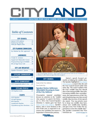 This issue of CityLand covers key land use and preservation developments in New York City as of March 2013. Highlights include City Council Speaker Christine Quinn’s State of the City Address, which focused on affordable housing and middle-class support. The Council held hearings on the Special Hudson Square District rezoning, with concerns raised about open space and landmarking the adjacent South Village. The Council also approved the rezoning of the Maple Lanes Bowling Alley site in Brooklyn for a 112-unit residential development and a synagogue. The City Planning Commission approved the Hudson Square rezoning with modifications, including height adjustments and open space commitments. Landmark hearings included revisions to the proposed building at 42 Crosby Street, the proposed designation of the Bialystoker Center and Home for the Aged, and a residential project in DUMBO. The Commission approved the reconstruction of a 19th-century carriage house facade in Brooklyn Heights. Guest commentary by NYC Comptroller John Liu criticized the Marriott Marquis lease as a $345 million giveaway. A profile of Council Member Stephen Levin highlights his advocacy for affordable housing, senior housing, and participatory budgeting. The issue also includes coverage of Speaker Quinn’s appearance at the City Law Breakfast and extensive charts on ULURP, BSA, and Landmarks activity.
