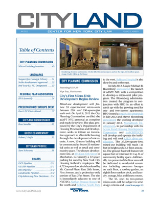 This issue of CityLand highlights key land use and preservation developments in New York City as of May 2013. The City Planning Commission began review of adAPT NYC, the City’s first micro-unit housing development, featuring 55 compact apartments and shared amenities. The Landmarks Preservation Commission held a hearing on the designation of the Seward Park branch of the New York Public Library, a 1909 Carnegie-funded building. A new sustainable office and retail development near the Puck Building in SoHo was approved, praised for its green design and contextual sensitivity. The Bedford-Stuyvesant/Expanded Stuyvesant Heights Historic District was designated, concluding a 20-year process. The Regional Plan Association’s 23rd Annual Assembly focused on climate change, infrastructure, and transportation technology, with contributions from Senator Gillibrand, Governor Malloy, and MTA Chair Prendergast. A panel of former LPC Chairs discussed the future of preservation leadership. Guest commentary by Robert J. Kafin explored the urban impact of Greenmarkets, and Sam Schwartz’s profile introduced his “Move New York” fair pricing congestion relief plan. The issue also includes extensive charts on ULURP, BSA, and Landmarks activity.